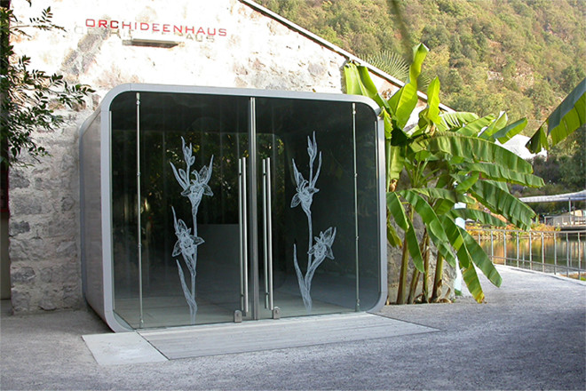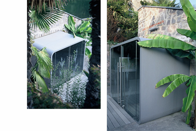 Zu diesem Zweck ist es notwendig einen Eingang zu schaffen, der zum einen ein konstantes Raumklima gewährleistet und gleichzeitig als Schleuse für das Schmetterlingshaus dient. Die in das Gebäude geschobene Box ist von außen durch das sandgestrahlte Glas und dessen Symbolik klar als neuer Eingang erkennbar. Die zweite Schicht in Form eines transparenten PVC-Streifenvorhangs leitet den Besucher ohne sichtbare Barriere ins Innere des Gewächshauses.